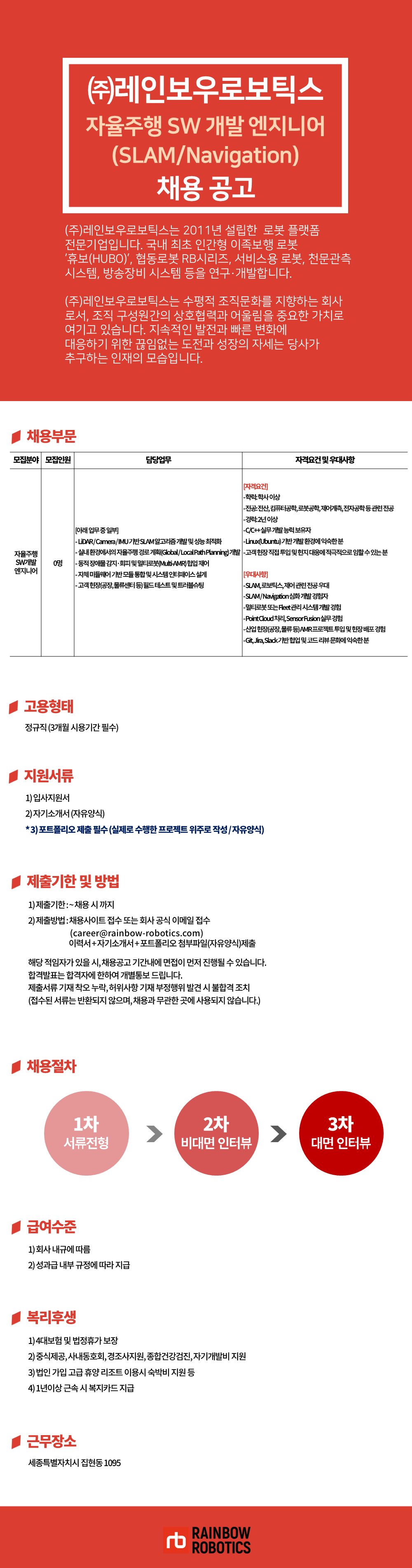 (주)레인보우로보틱스 자율주행 SW개발 엔지니어(SLAM/Navigation)